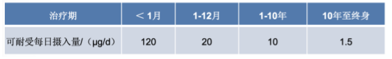对于治疗期大于10年至终身的药品,TTC值为1.5μg/天,低于此限值的日摄入量导致癌症风险小于十万分之一,其风险可忽略不计,因此TTC可作为大多数药品可接受限值的默认值。
