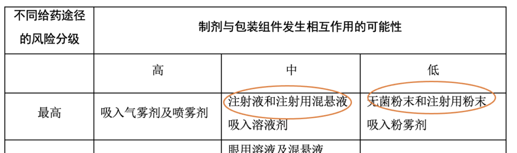 表 1 不同给药途径药品的风险分级及其与包装组件发生相互作用的可能