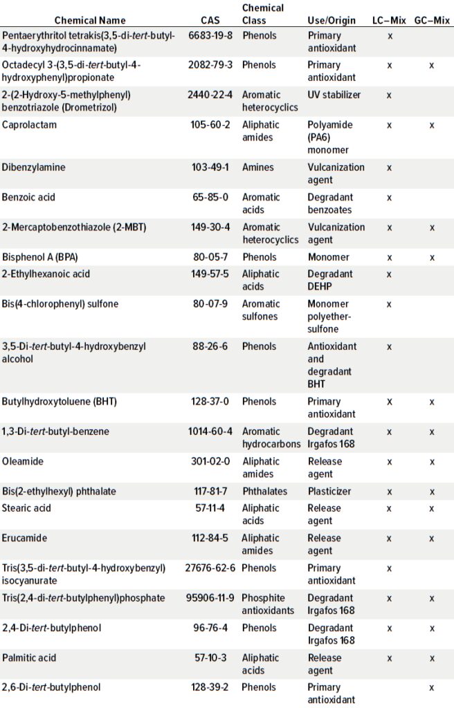 表1显示了用于LC和GC的E&L筛选标准的组成。包括化学类别的分类以及常见用途和来源,涵盖了典型的抗氧化剂和降解剂、加工助剂(如脱模剂、固化剂、增塑剂、紫外线吸收剂和聚合物单体),以及E&L研究中可能遇到的大多数化学类别。