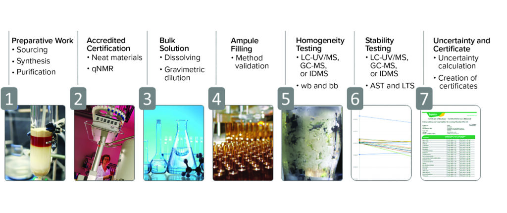 CRM的开发和制备遵循ISO的流程,并使用经ISO/IEC-17025认证的分析方法。从混合物中不同组分的合成和纯化开始,到生成证书结束。如图2所示,从混合物中不同组分的合成和纯化开始,到生成证书。