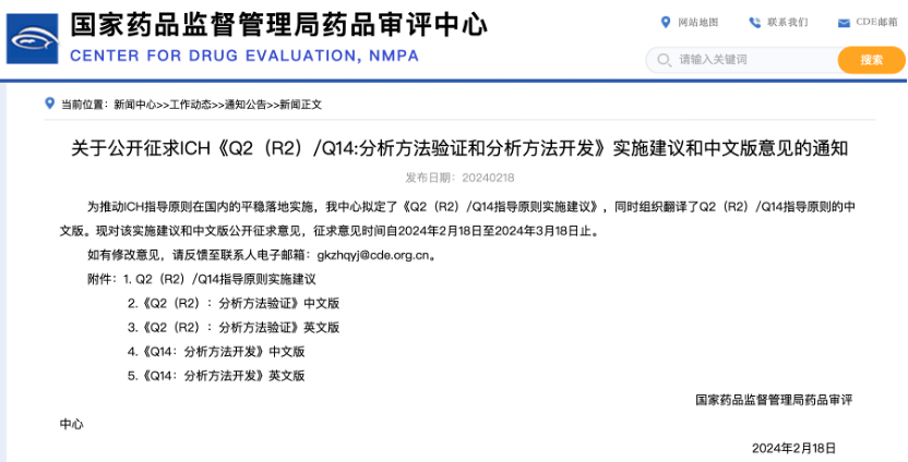 2月18号,国家药监局药品评审中心公开征求 ICH《Q2(R2)/Q14:分析方法验证和分析方法开发》实施建议和中文版意见。
