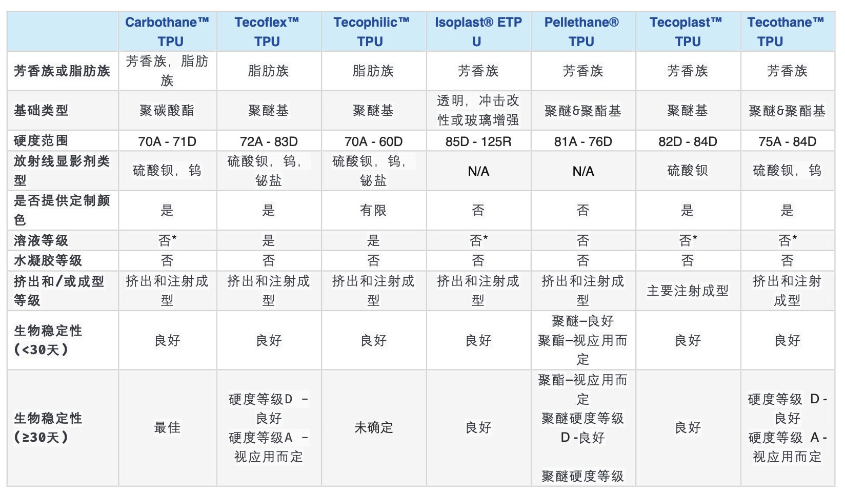 不同品牌TPU材料特性汇总 本文表格中列出了不同品牌的热塑性聚氨酯(TPU)材料的特性 Note: 表格中的"N/A"表示不适用或未提供相关信息。 *表示“挤出级和注射成型级的塑料可以在特定的有机溶剂中溶解。” 不同品牌TPU特性汇总表