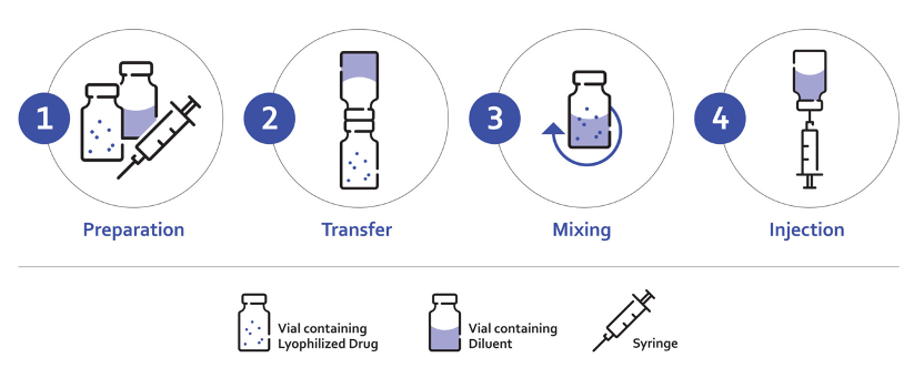 这一过程通常由训练有素的医疗提供者或护理人员执行,并需要使用瓶适配器和瓶对瓶系统。药物产品复溶后,必须将其吸入注射器并注射。这个过程可能会向溶液中引入气泡,且依赖于用户准备准确剂量的技能。有研究发现,使用1毫升注射器准备建议剂量时,存在准确性、精确度和重复性方面的显著变化。