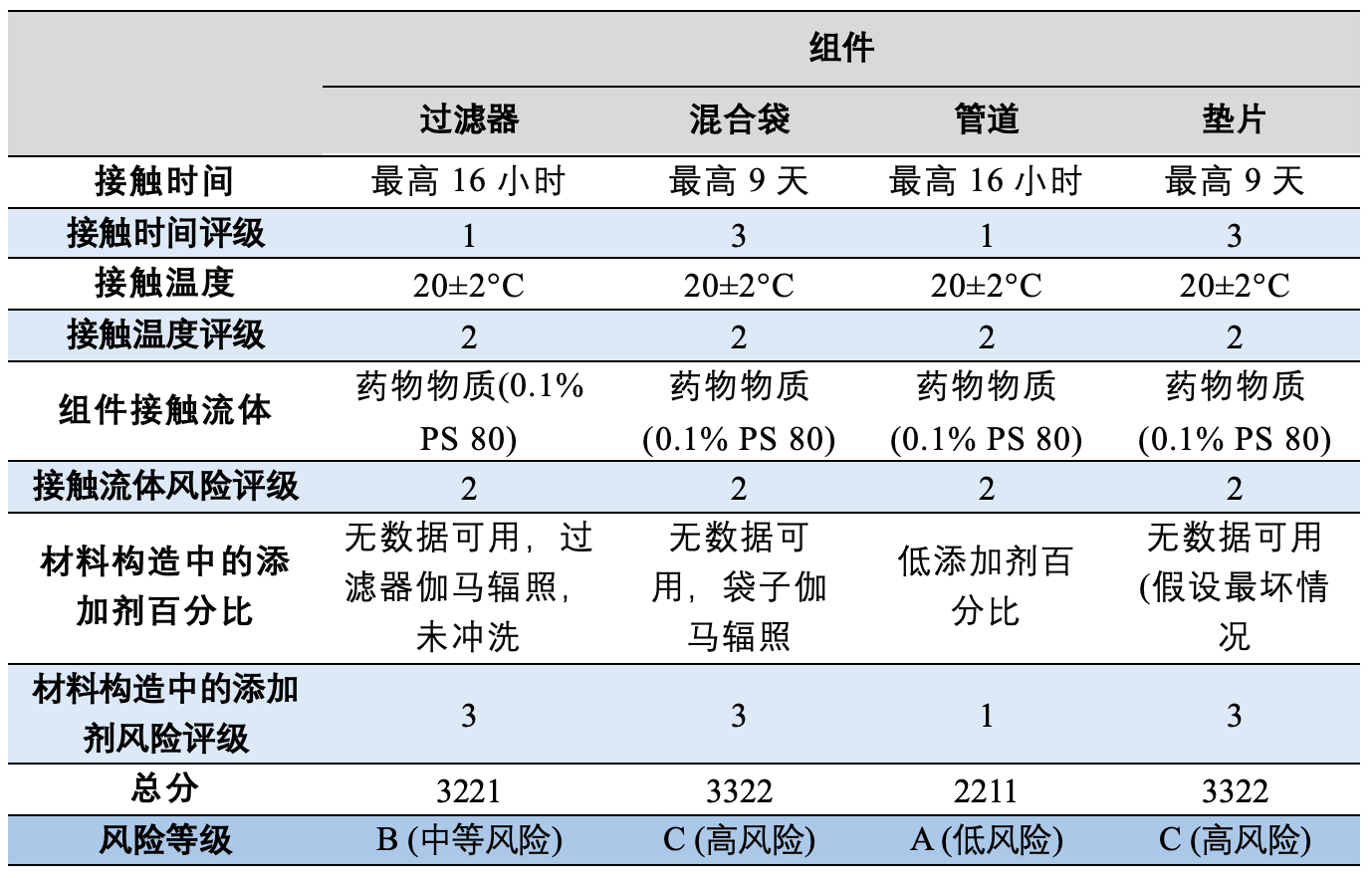 采用USP<1665>中定义的方法,对生产过程中的四个聚合物组件进行了风险评估,可参考文章生产组件相容性研究USP<665> Q&A。表1提供了与组件相关的风险评估得分。一些组件供应商提供了提取研究数据,表2展示了供应商提供的提取研究条件。