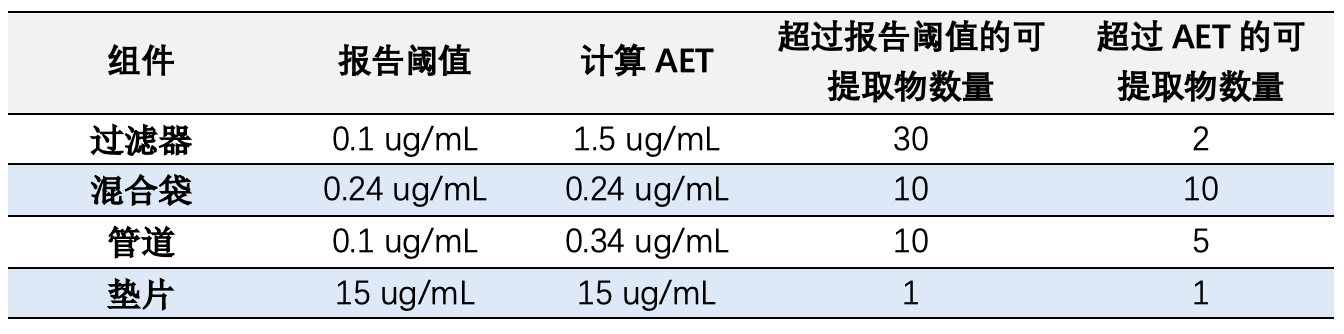 高于分析评估阈值(AET)的可提取物应由毒理学家评估,以确定对患者安全的潜在风险。尽管供应商报告了过滤器和管材的许多可提取物,但并非所有可提取物都高于AET,只有高于AET的可提取物应进行毒理学评估。混合袋和垫片的报告阈值已与AET一致,因此,所有检测到的分析物都应进行毒理学评估。