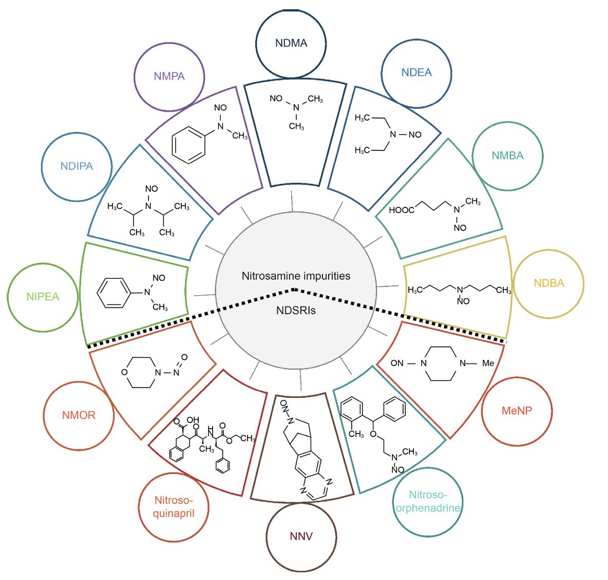 大约20%的当前小分子仿制药具有活性胺官能团,在特定条件下可能与亚硝胺杂质反应形成NDSRIs。这些条件包括存在亚硝胺杂质剂(如亚硝胺杂质)、适当的胺或酰胺基团,以及适宜的化学条件,如高温、酸性条件或液态环境。