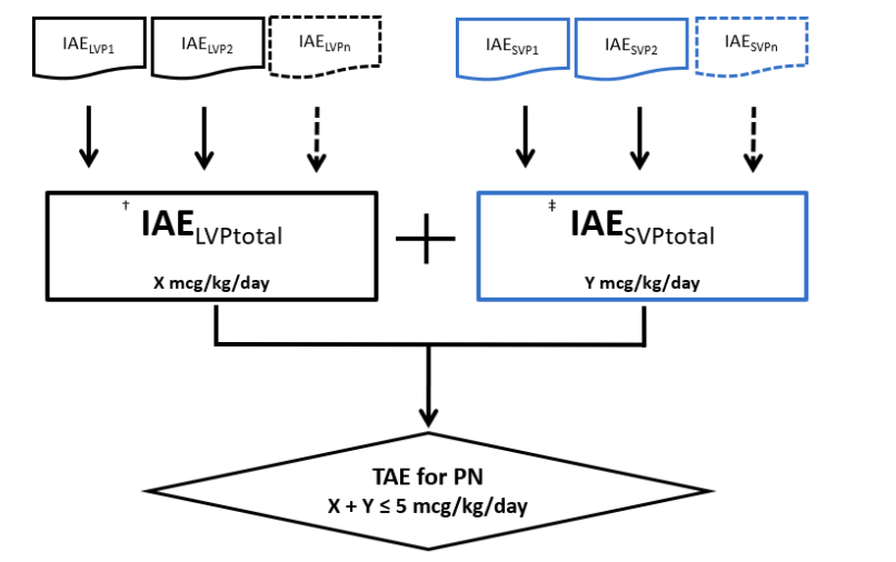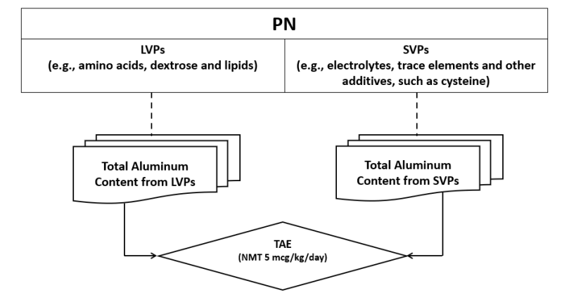 总铝暴露量(TAE)的限制: FDA建议,来自长期使用肠外营养(PN)所有组分(包括大容量注射剂LVP和小容量注射剂SVP)的总铝暴露量不应超过4-5 ug/千克/天。这一阈值是评估PN方案安全性的重要参考。
