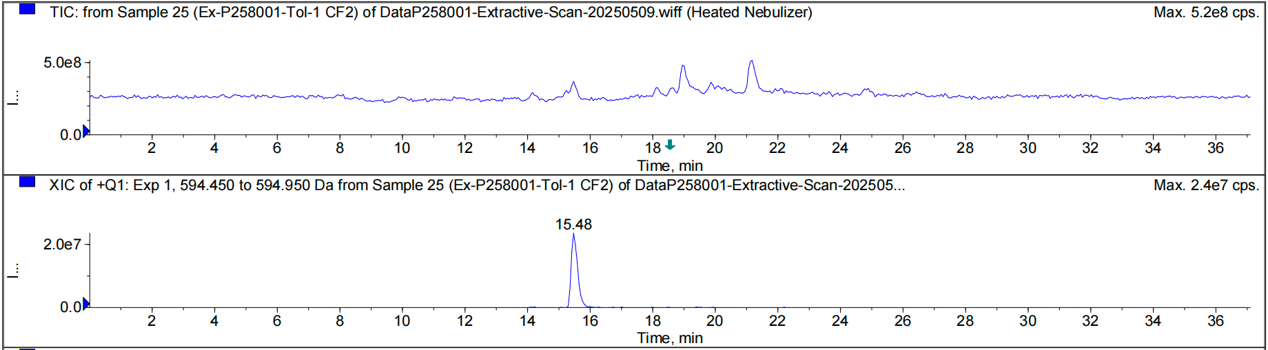 全扫描分析发现未知可提取物,保留时间RT为15.48min