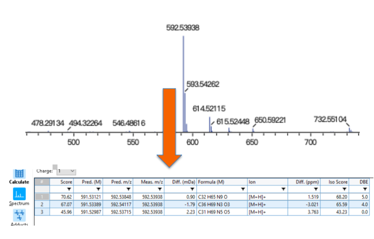 MS1谱图导入LabSolutions Insight软件分析可能的分子,误差范围设置为±10ppm以内,软件给出最有可能的结果,误差范围在±5ppm以内: