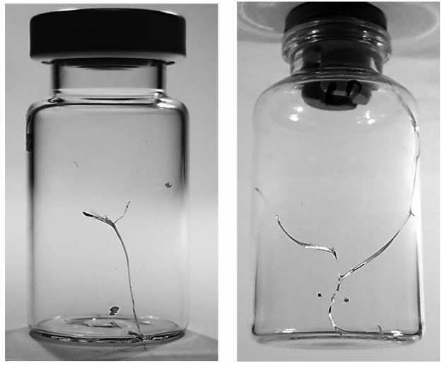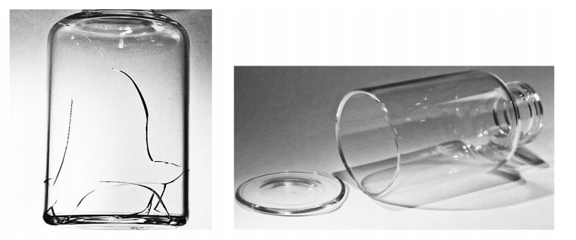 图2:因内压力作用导致破裂的玻璃瓶实例 左为相对高压的情况 右为相对低压的情况