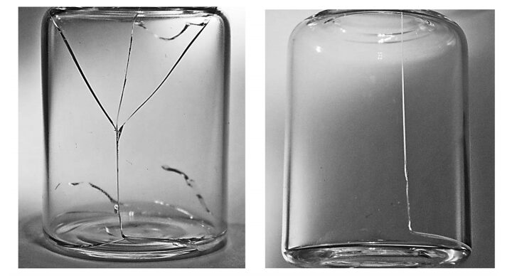 图3:因热冲击作用导致破裂的玻璃瓶实例 左为相对高的温差情况 右为相对低的温差情况