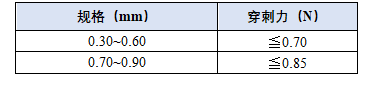 >预灌封注射器即可以作为包装容器,也能作为注射器使用,因其使用简单方便的优点被广泛应用。在临床使用中,注射针穿刺力大小影响其注射时能否顺利穿透皮肤,与使用者的舒适感密切相关,注射针穿刺力与针头的长度、直径、针头抛光、润滑和针尖几何形状等因素相关。 标准**《预灌封注射器用不锈钢注射针》YBB00092004-2015**,对不同规格注射针穿刺力规定限度范围,见下表: