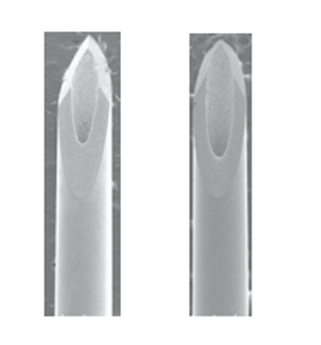 此外,相比三斜面注射针,五斜面注射针的斜切边缘之间具有更大的三角,额外倾斜导致更短的切割,更有助于注射,见下图。
